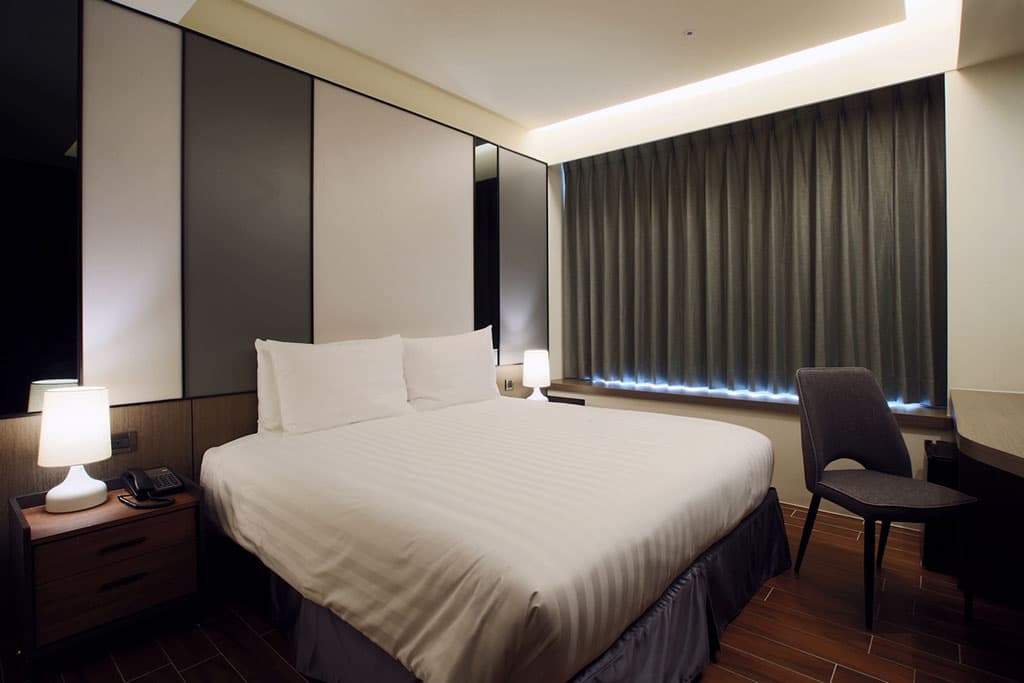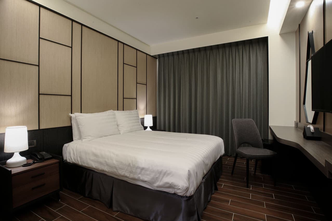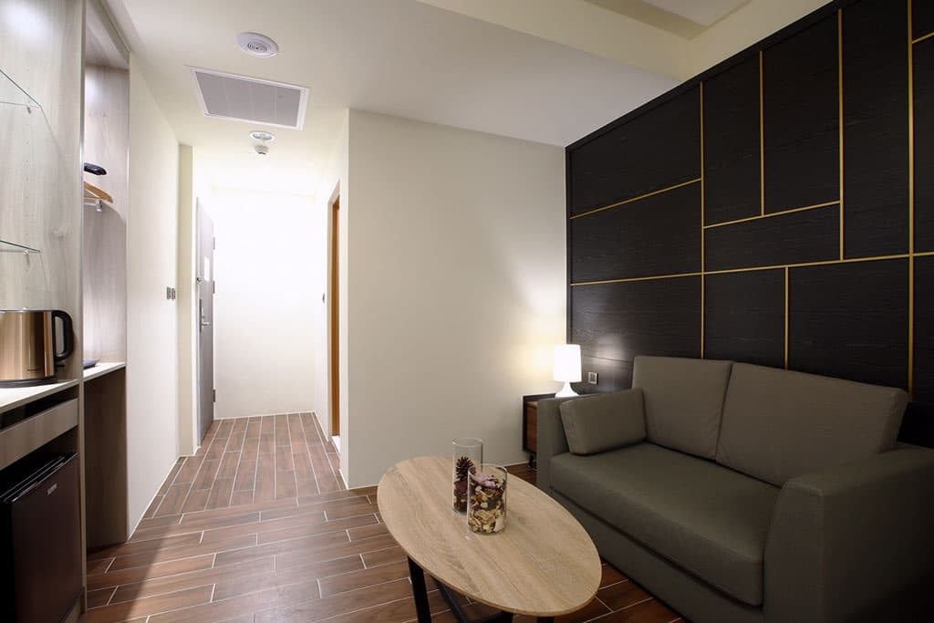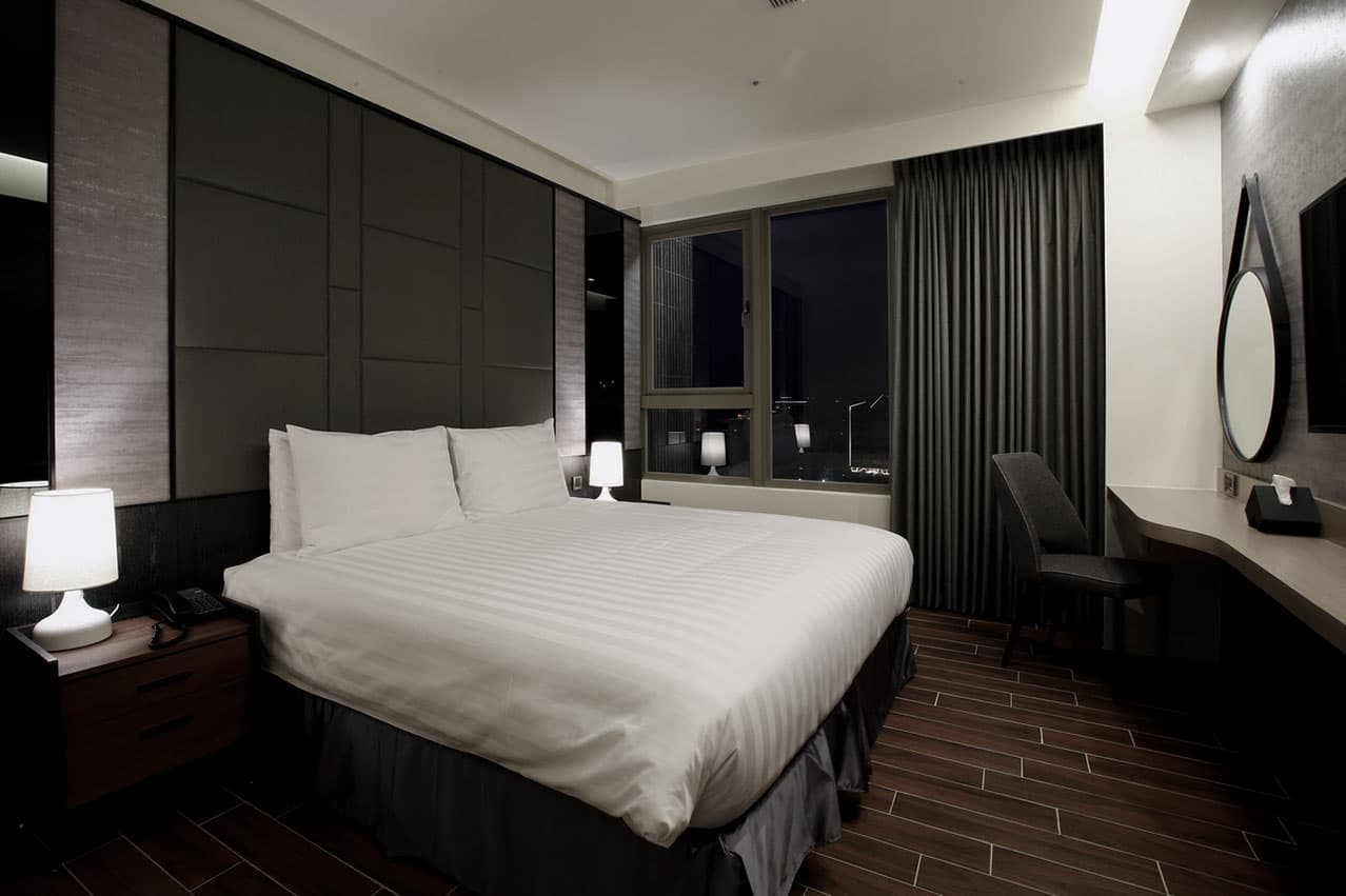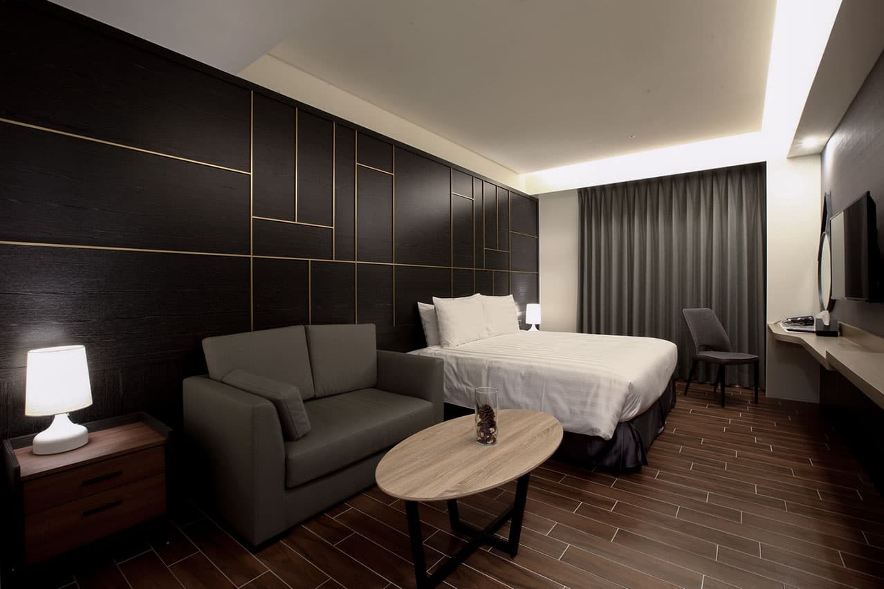 寬徜的客廳空間配置有沙發與茶几,方便您外帶週邊美食回來飯店享用,床型為一張加大雙人床,較大的空間方便行李整理與擺放,適合規劃多天數旅程的旅客使用。