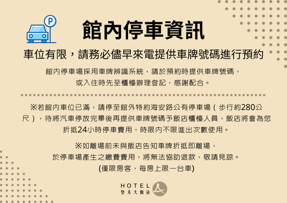 Hotel A 聖禾大飯店館內車位有限,請務必來電預約(預約專線:06-2200...